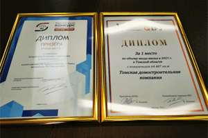 Первый диплом традиционный – за первое место по объему ввода жилья в Томской области. В 2021 году ТДСК сдала в эксплуатацию для жителей региона 64 487 квадратных метров общей площади квартир. Второй диплом – за второе место в номинации «Лучший жилой комплекс-новостройка в Томской области» за жилой комплекс «На Комсомольском».