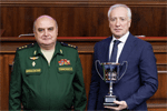 Начальник центра Национального центра управления обороной РФ Станислав Гаджимагомедов вручил губернатору Томской области Владимиру Мазуру почетный кубок за достижение высоких результатов в решении межведомственных задач в области обороны.