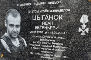 Мемориальная доска в память о бойце специальной военной операции Иване Цыганке установлена на фасаде здания оборонно-спортивного клуба «Десантник» в городе Стрежевом Томской области.